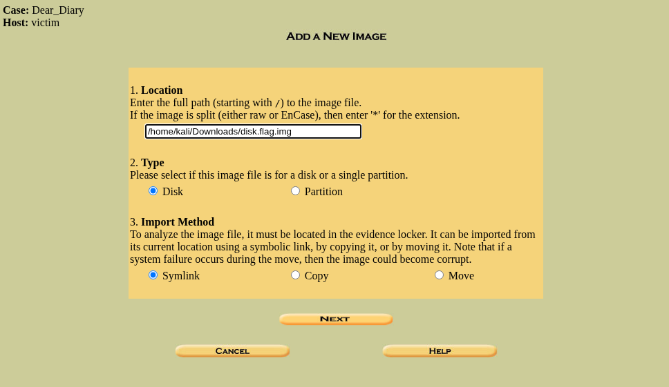 We will be working on a challenge named “Dear Diary” from picoCTF to work with Autopsy.