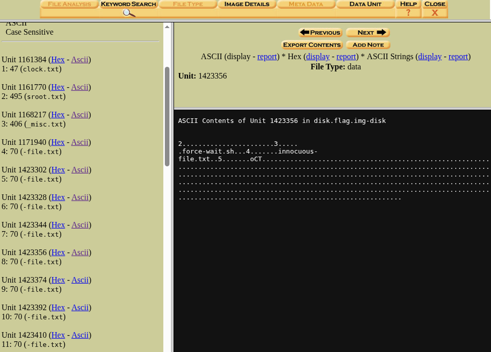Now we are ready to anlayze, let’s start analysing from the top which is disk.flag.img.disk.