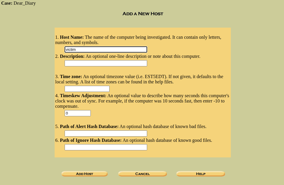 As there aren’t any Host in my Autopsy yet, let’s add one by clicking on “Add Host” this will present the below image: